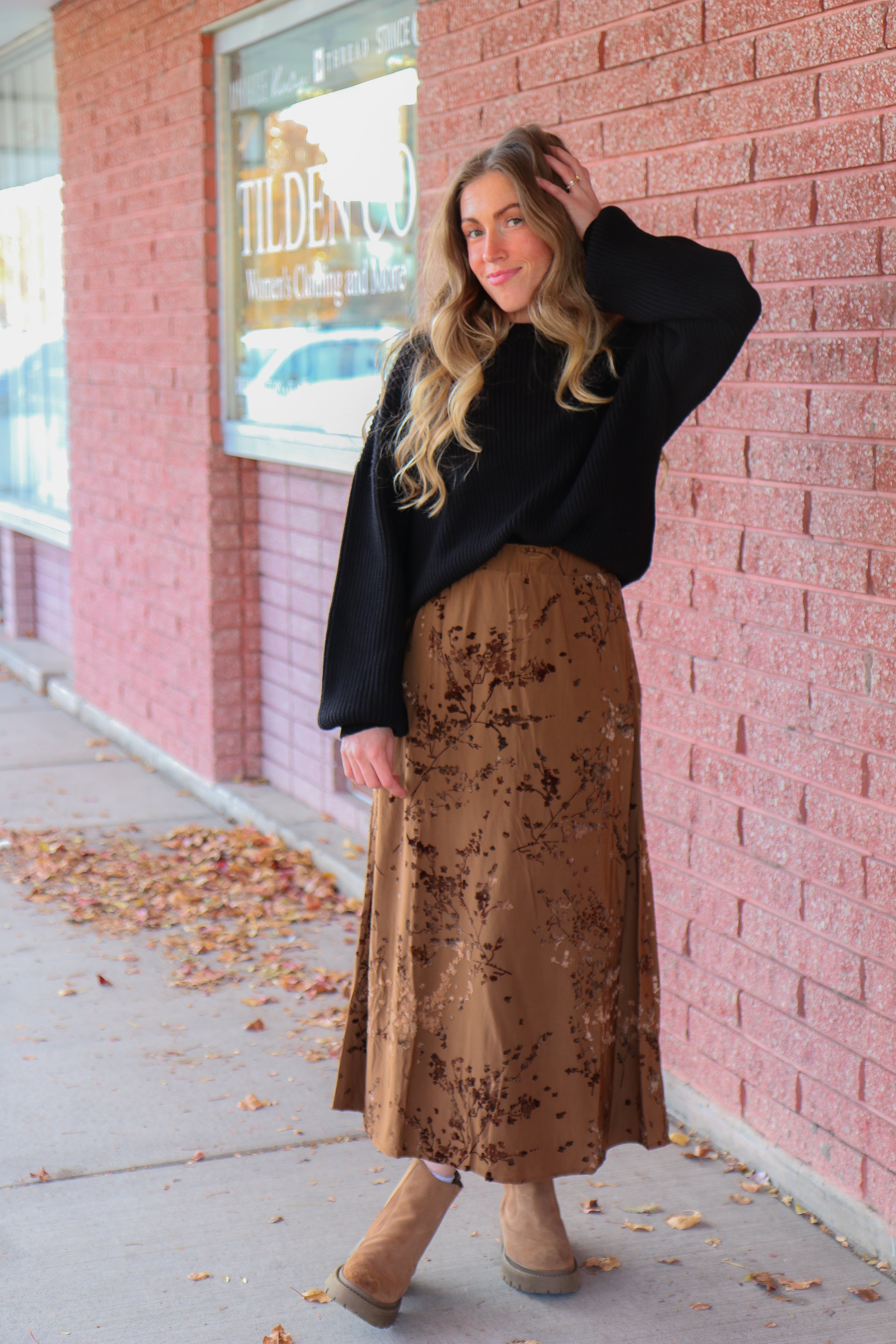 Elevate your wardrobe with the Midi Slip Skirt in Luxe Blossom, a sophisticated piece that blends effortless elegance with everyday comfort. This midi-length A-line skirt features a soft elastic waistband for a perfect fit and convenient pockets for a practical touch. The bronze base is adorned with a textured blossom floral pattern, adding depth and a subtle shimmer that makes it perfect for seasonal styling or special occasions. Its flowy silhouette moves beautifully with every step, giving you an easy, polished look.