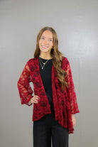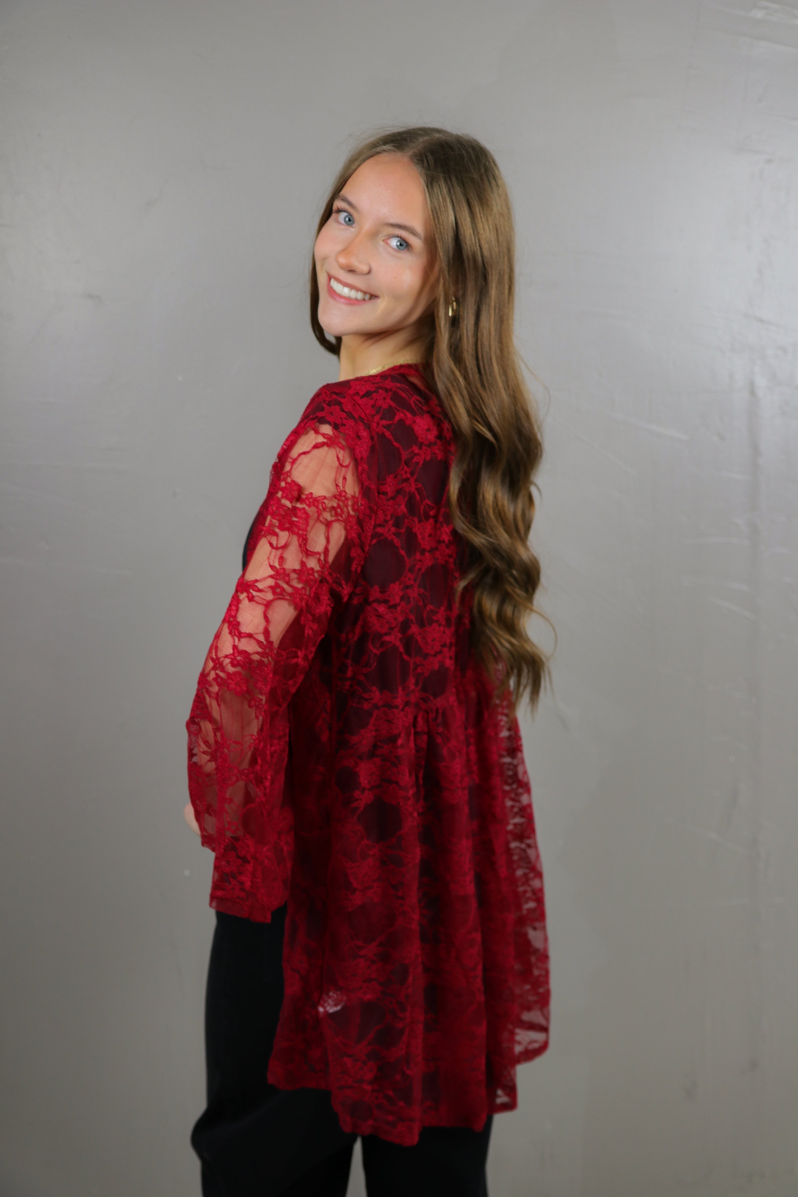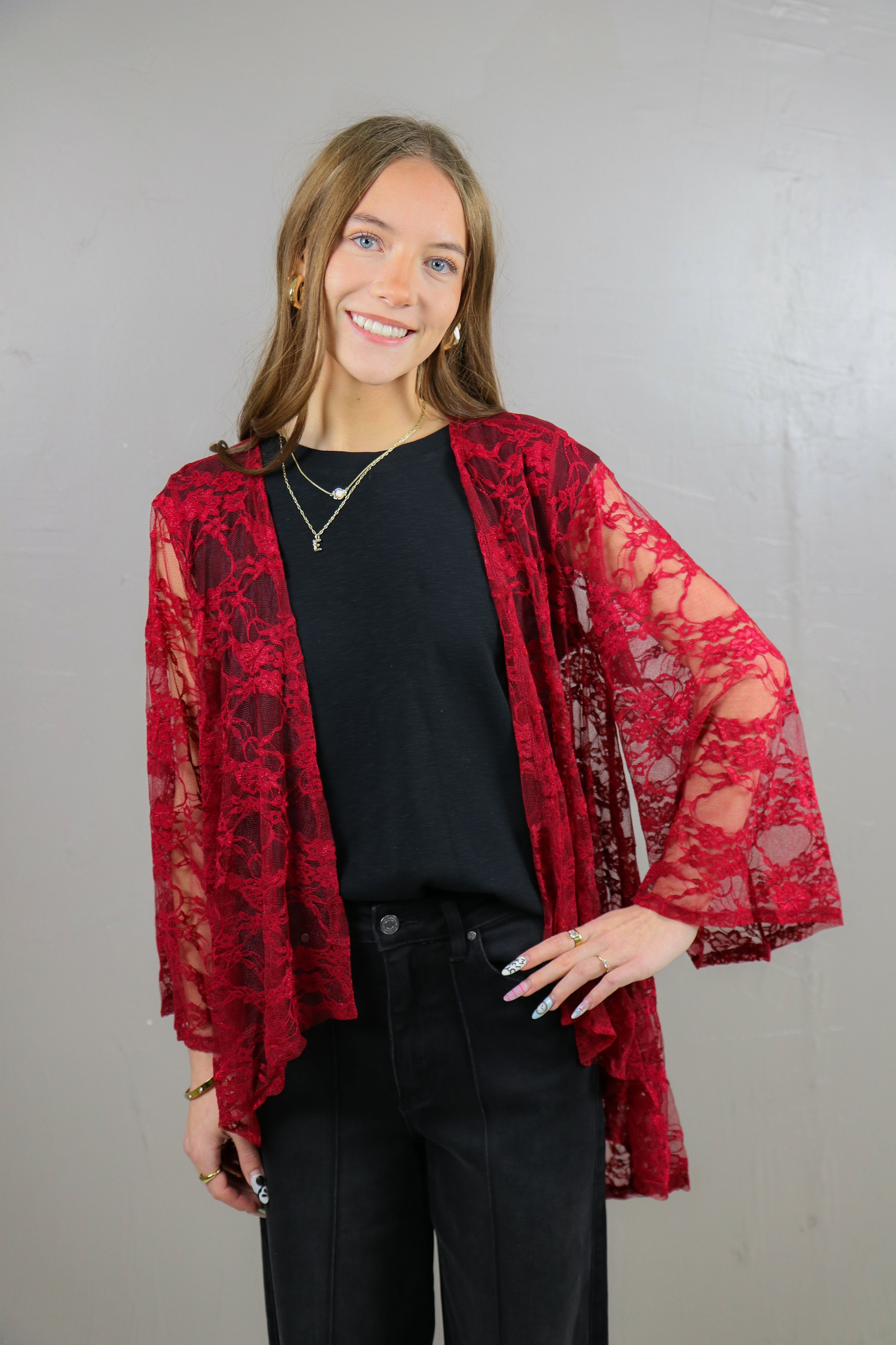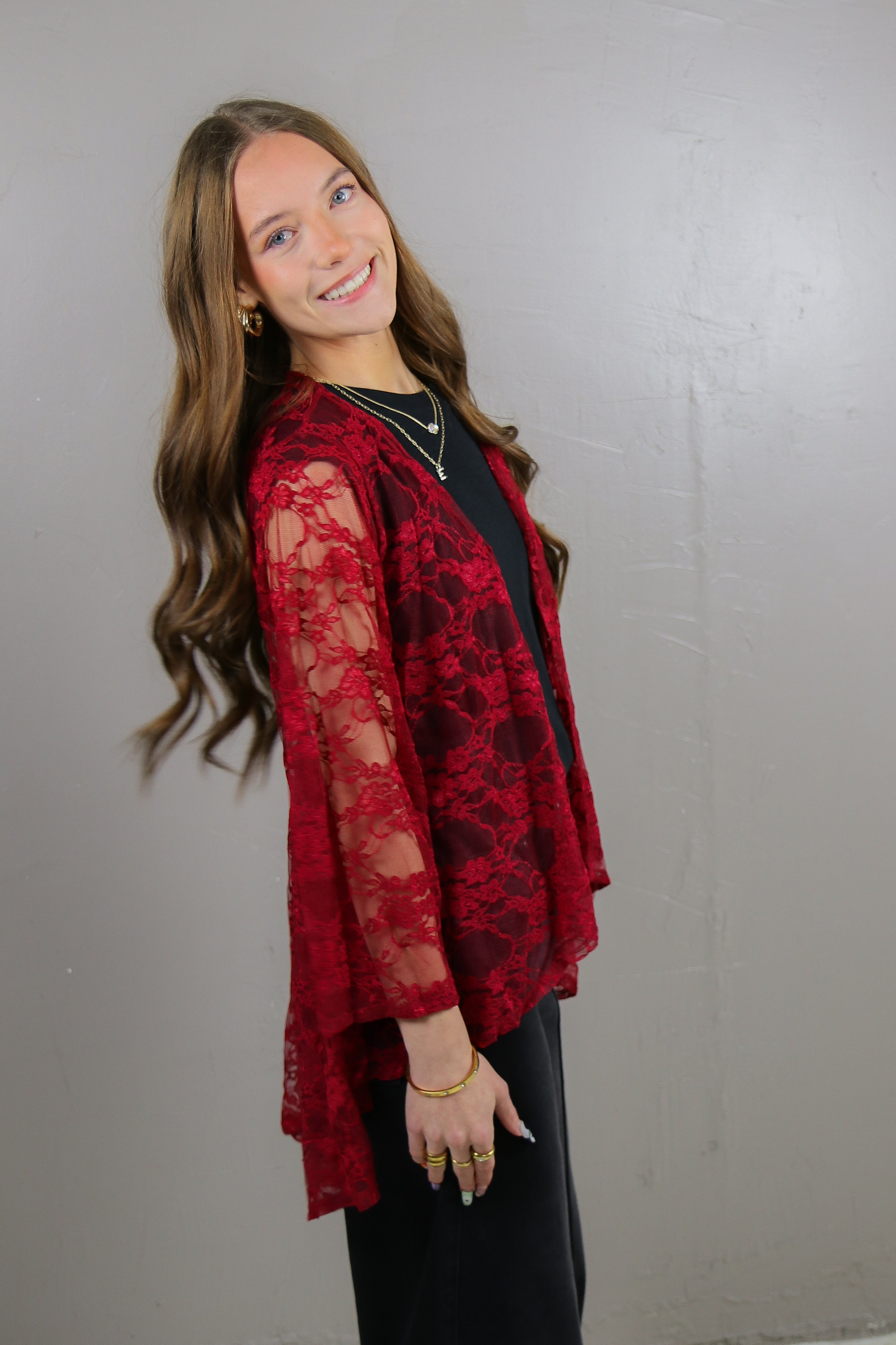 Layer the Velourvine Lace Cardigan over a fitted tank or bodysuit with denim for an elevated everyday look, or wear it over a sleek dress for romantic evenings out. The open front creates flattering vertical lines, while the rich wine color complements both neutrals and jewel tones. It’s especially stunning paired with black, cream, or soft blush pieces for a balanced, polished outfit.