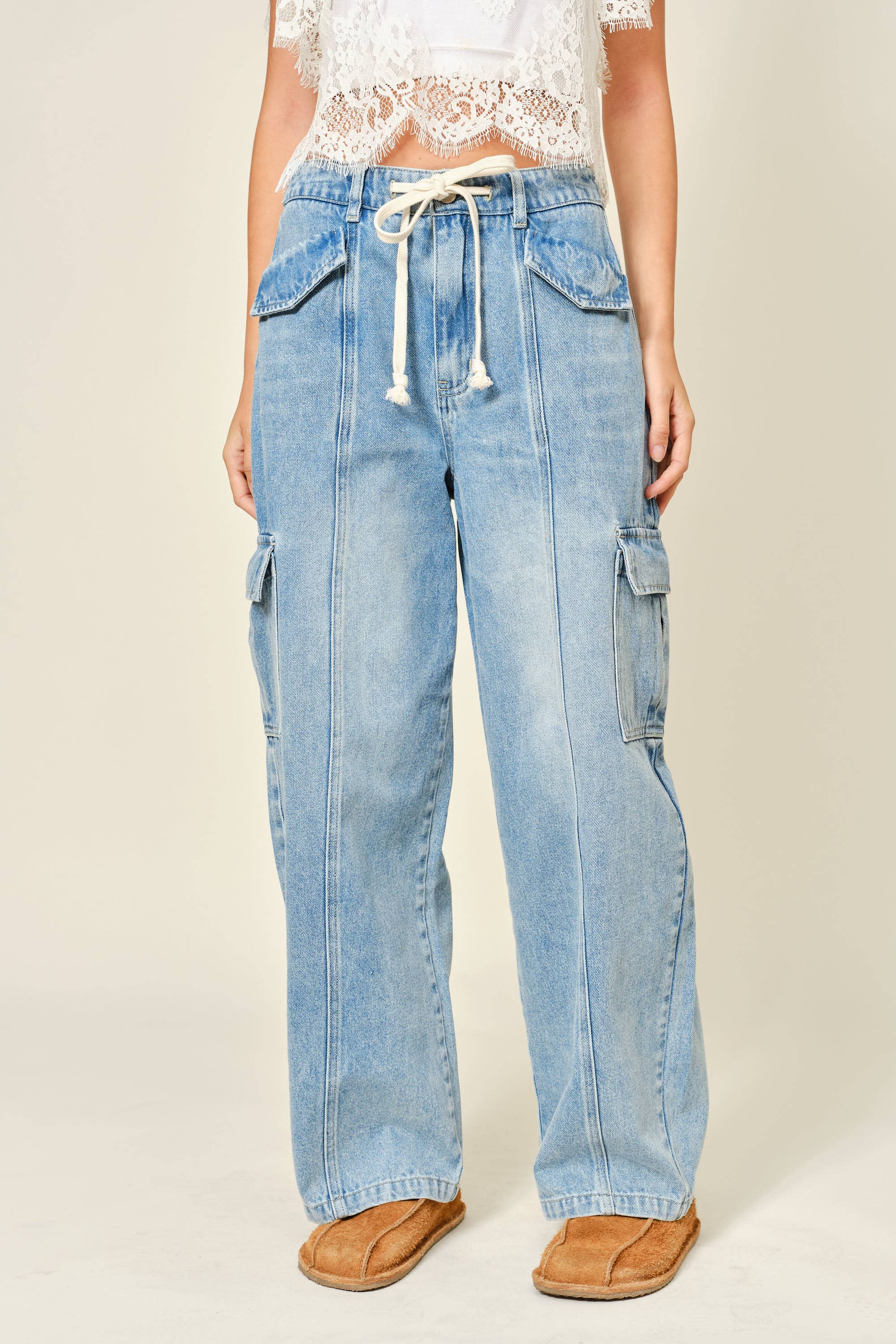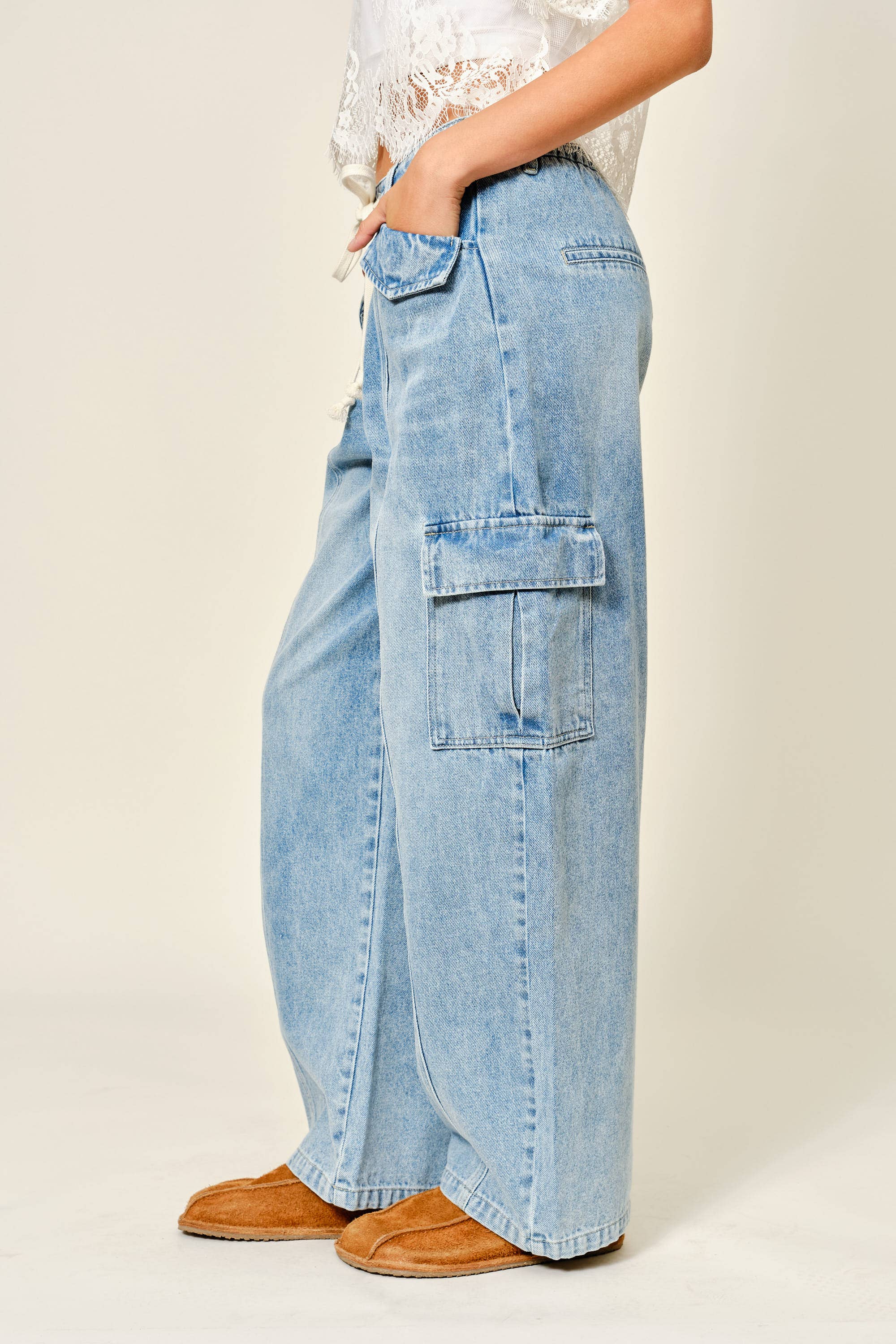 Cargo-style side pockets add functional edge and visual interest, giving these jeans that cool utility vibe without feeling bulky. The light denim wash keeps them versatile and easy to style from casual outings to laid-back evenings.