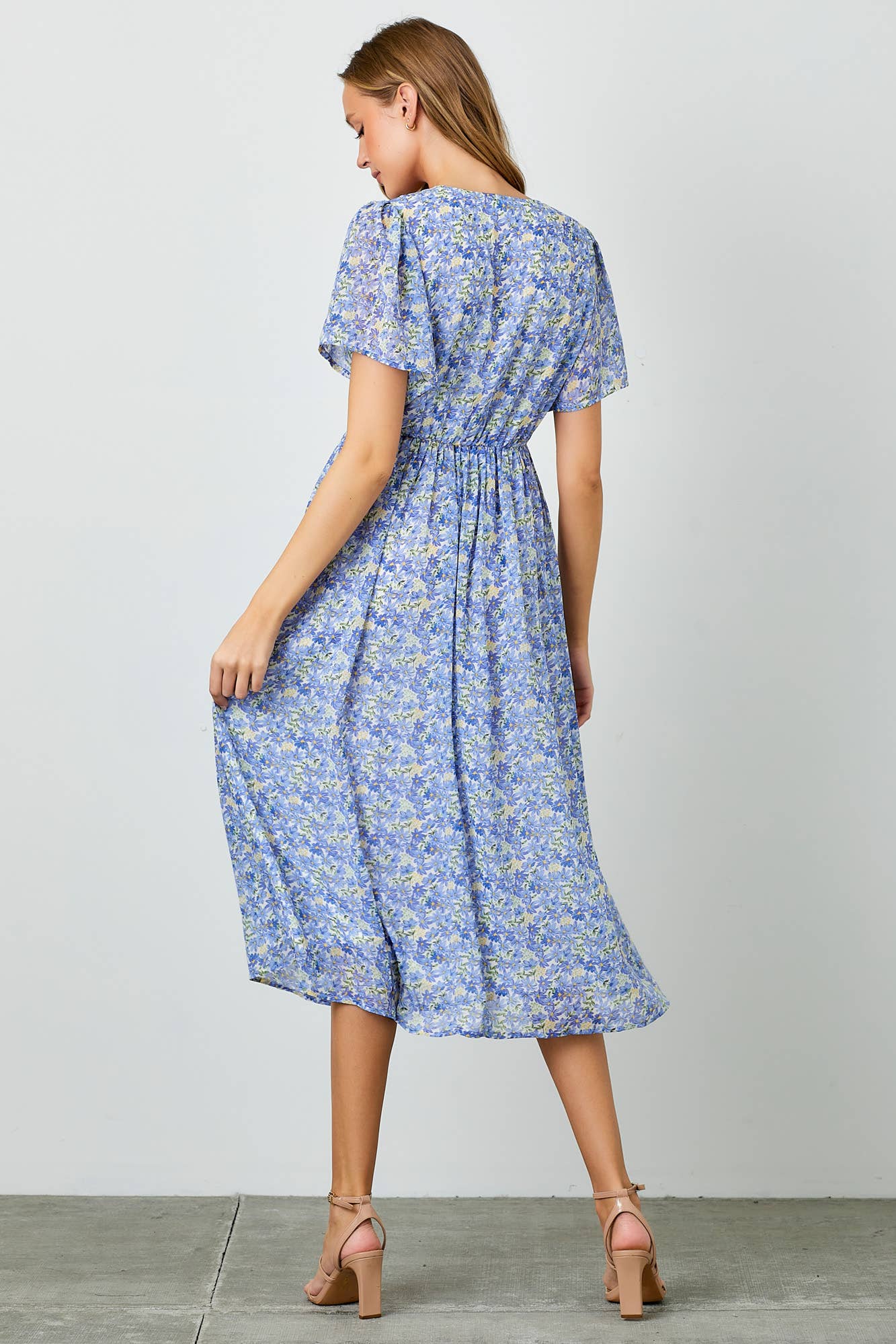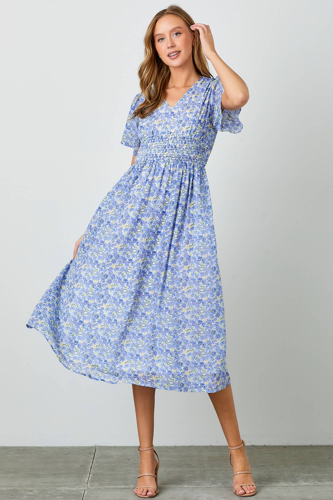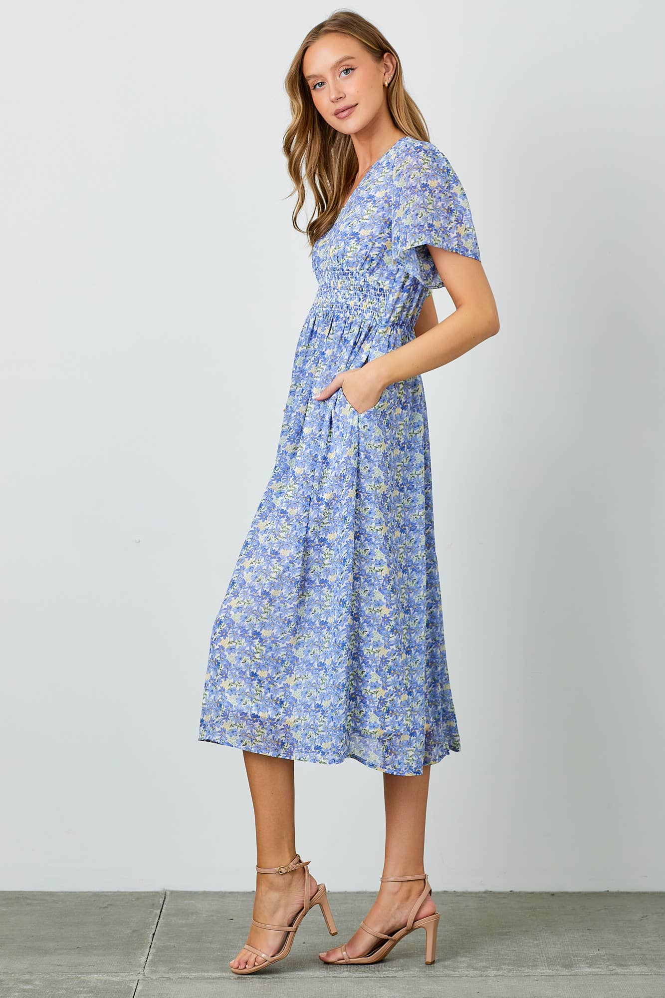 Effortlessly feminine and easy to wear, this blue floral day dress is perfect for warm, sunny days. Designed with a flattering smocked waistline and soft chiffon fabric, it creates a comfortable silhouette that moves beautifully. The V-neckline and short sleeves keep the look light and classic, while side pockets add a practical touch you’ll love.