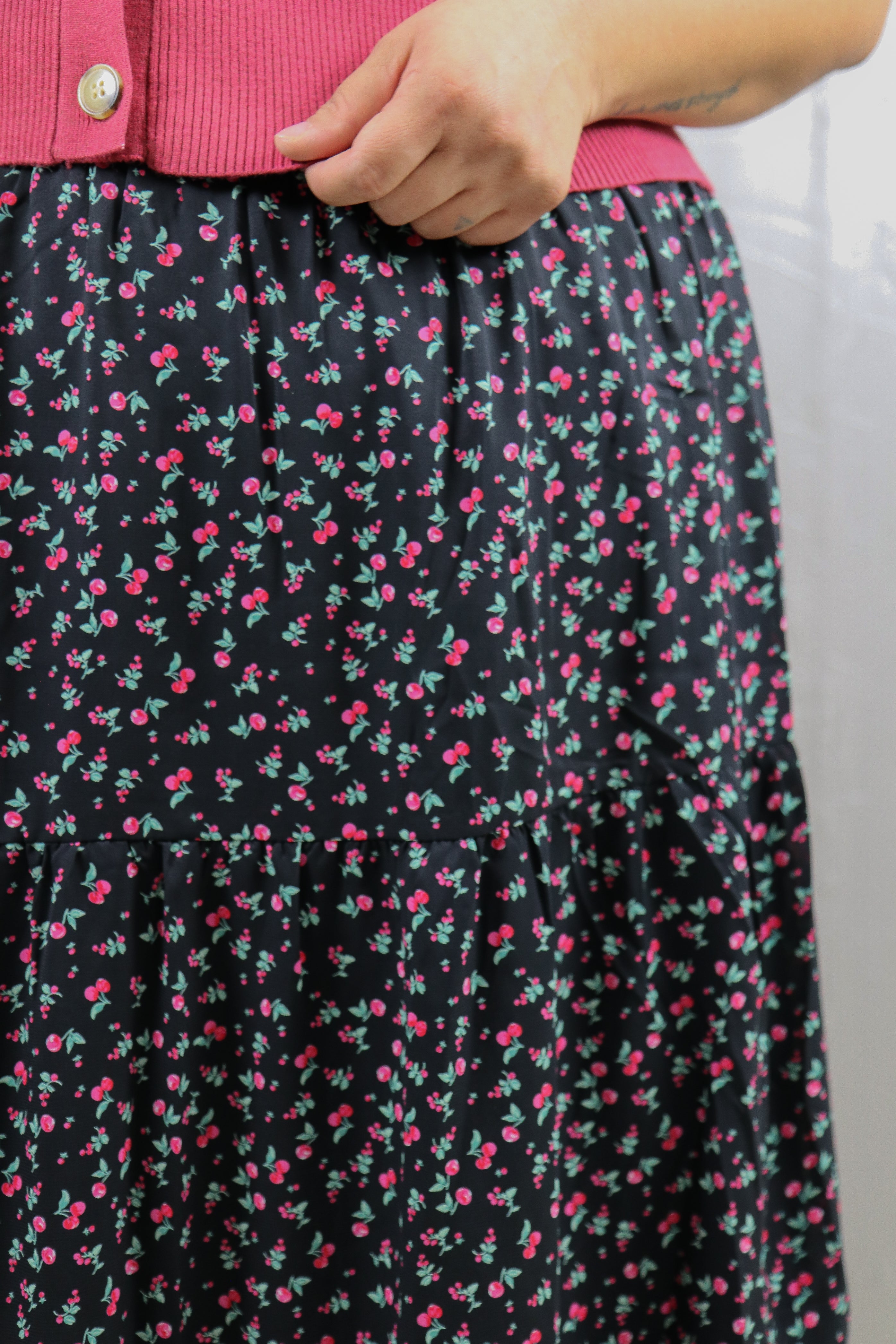 Sweet, flirty, and effortlessly romantic, the Cherry Punch Maxi Skirt is the perfect foundation for a classic Valentine’s outfit. Its tiered, flowing silhouette moves beautifully with every step, while the smocked waist provides a flattering, comfortable fit. Set on a black base with dainty red and green florals, it pairs perfectly with our Short Sleeve Cardigan in Red Bud for a polished, sophisticated, and timeless look that’s all about romance and elegance. ❤️