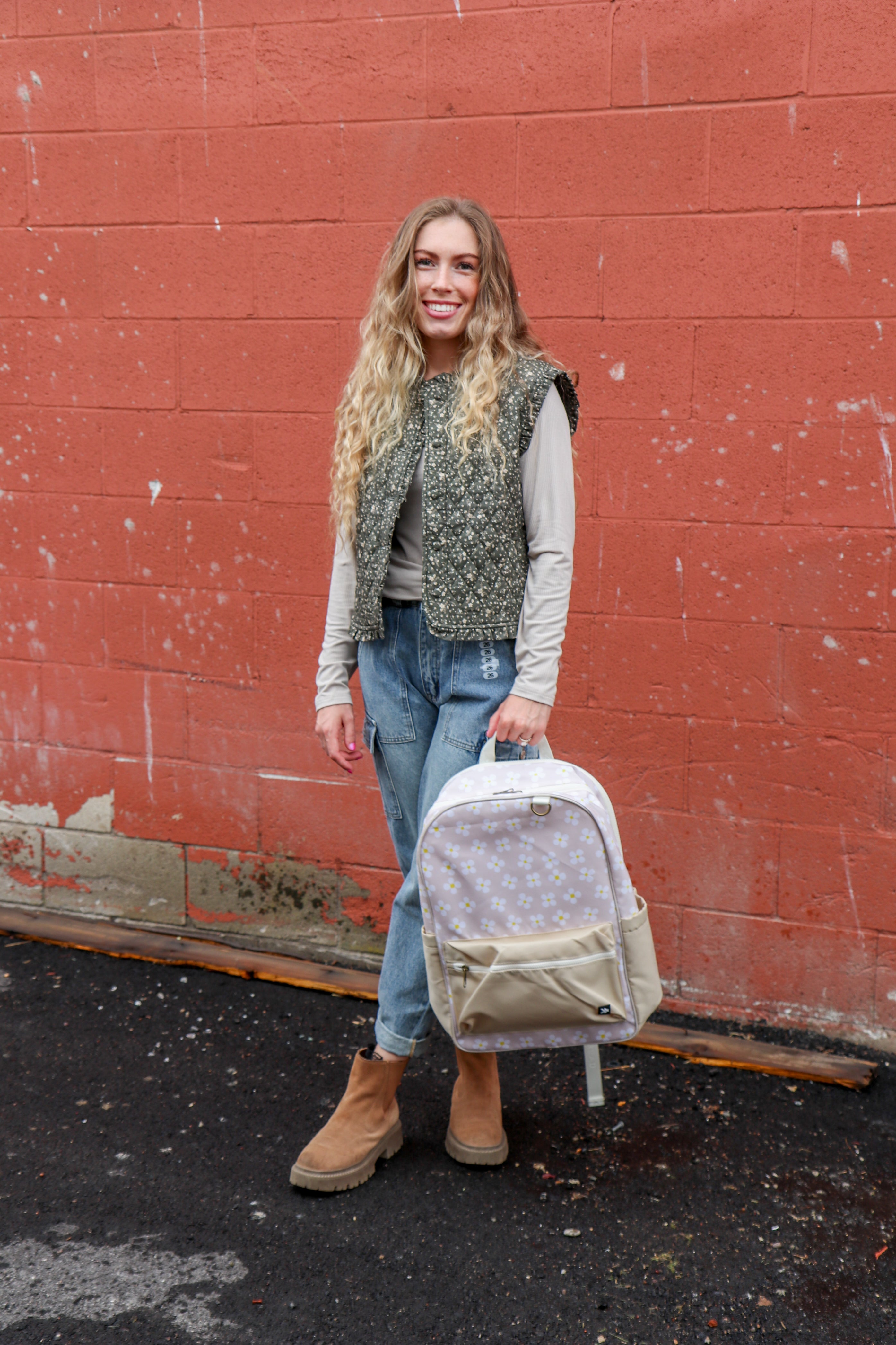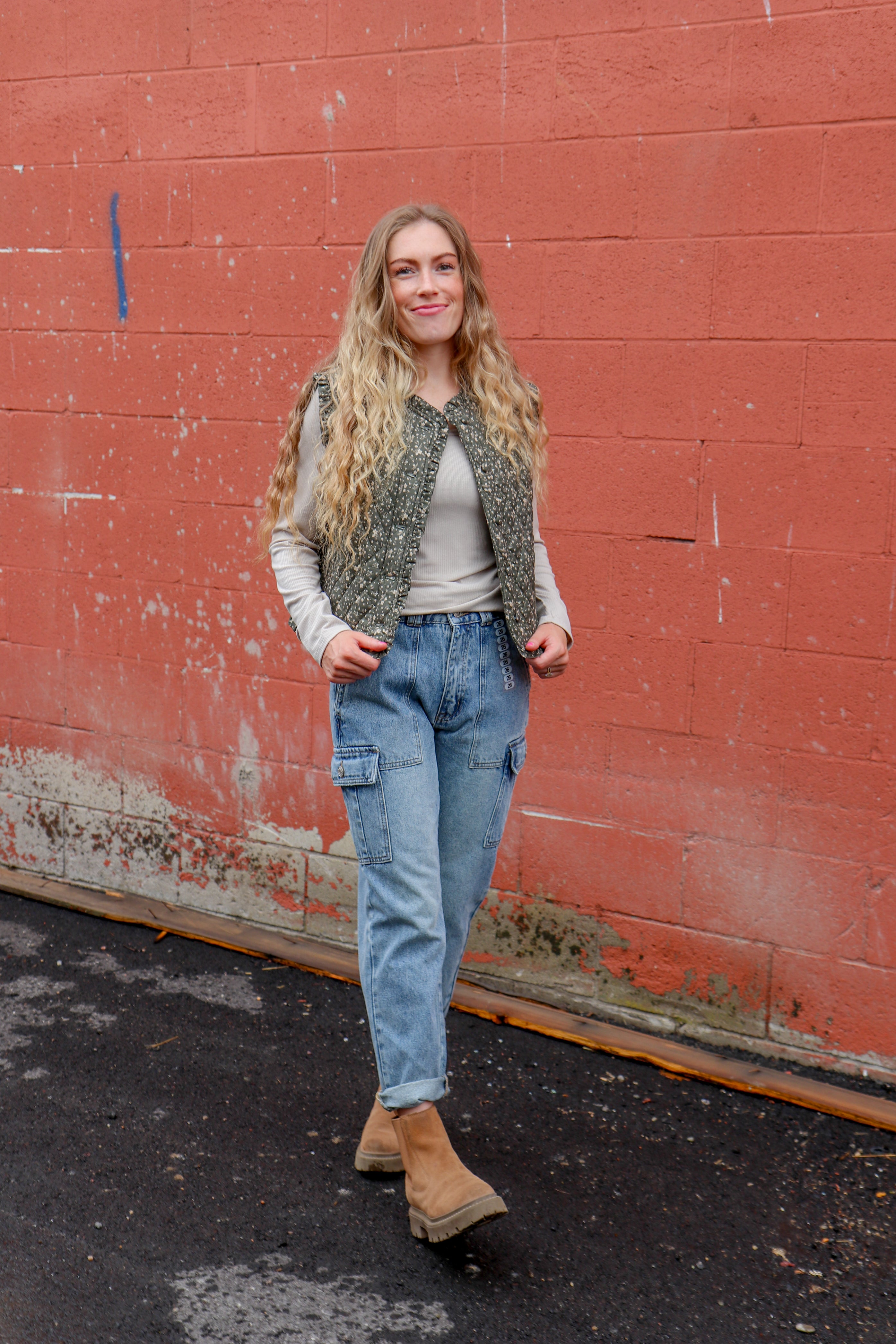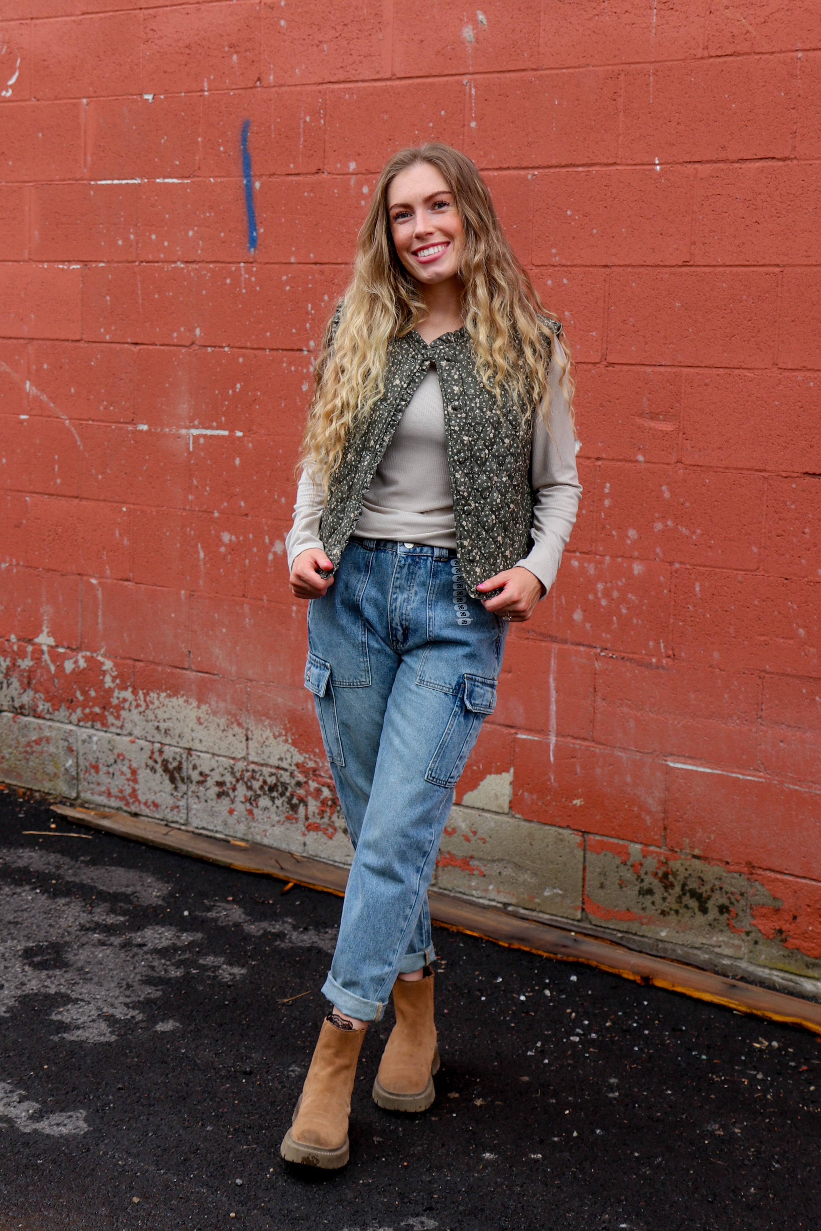 The Meadow Charm Quilted Vest is where cozy meets feminine. Crafted in a deep green ditsy floral print with soft cream accents, this sleeveless beauty features a relaxed fit, button-down front, and charming ruffle details that frame the neckline and shoulders. The quilted woven fabric adds texture and warmth without feeling heavy—perfect for layering over a lightweight tee in the fall or a chunky sweater in the winter.