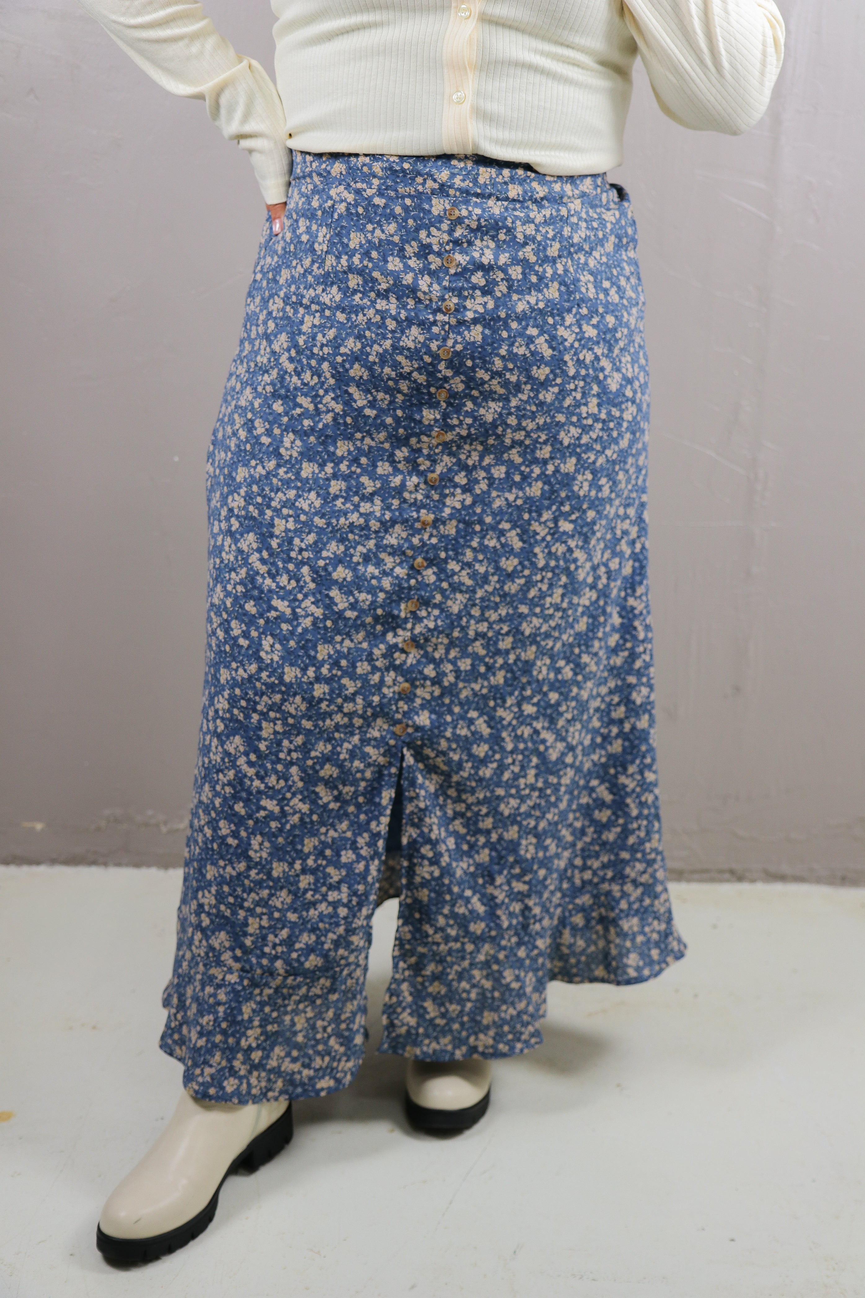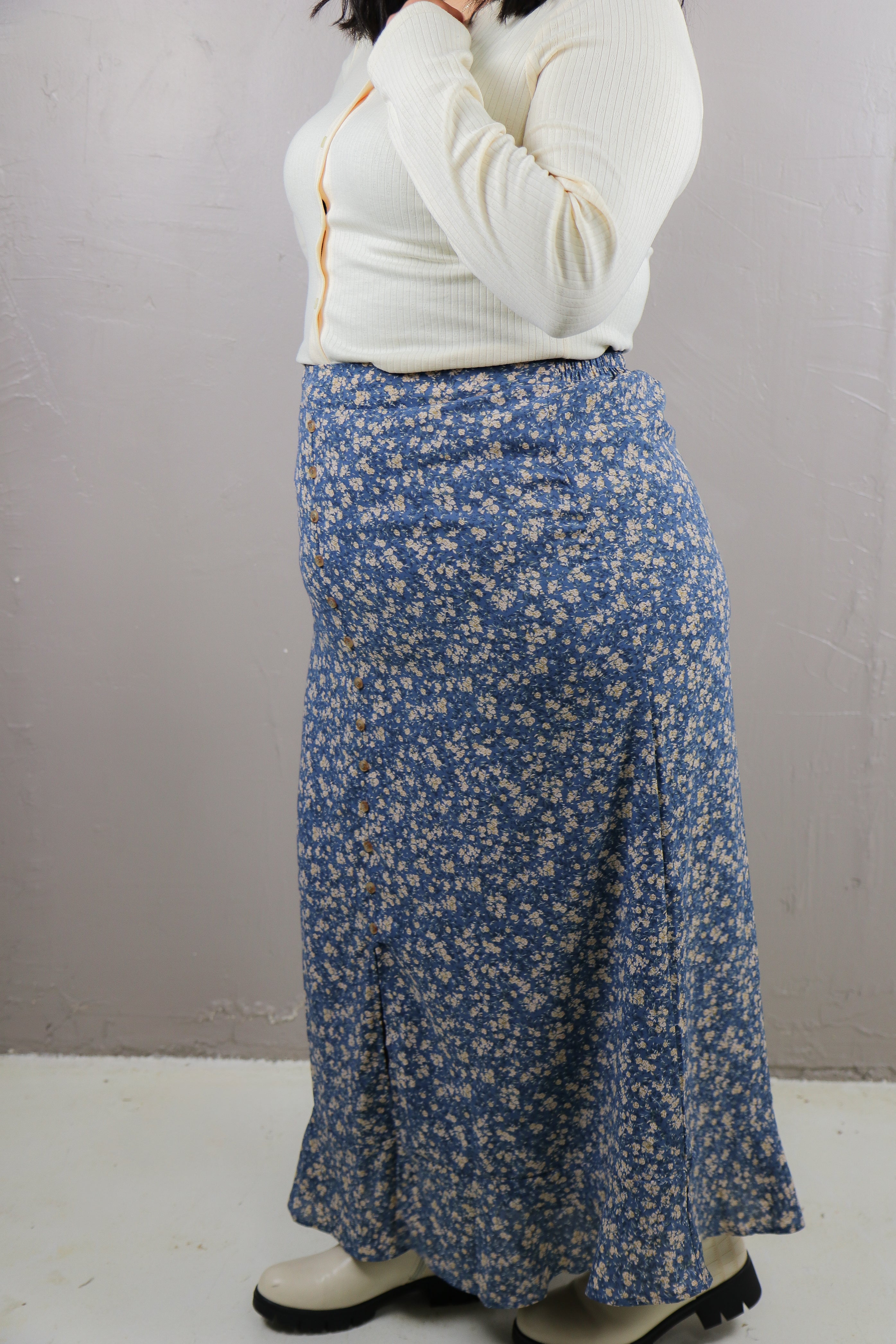 Wispy Blue Maxi: natural waist, ruffle details, and front slit for flirty, flowing movement