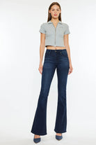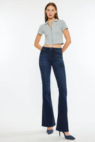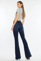 details for a classic blue jean look. Sits right at the natural waistline for an easy fit that contours the hips and thighs as it flares out at the leg. Made with super-soft stretch denim that's flexible, breathable, and durable. Features a classic-five pocket design, single-button front, and zip-fly closure.