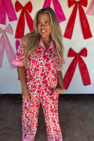 Our Luxe PJ Lounge sets are the perfect sleep set for both comfort and style. Features a button-up top with short sleeves and matching PANTS, with cute new designs that will keep you looking good while you relax. The fabric is ultra-soft, STRETCHY and lightweight for a relaxed feel. Pants have pockets and elastic waist. Feature contrast fabric on trim and collar for an extra "luxe" feel.