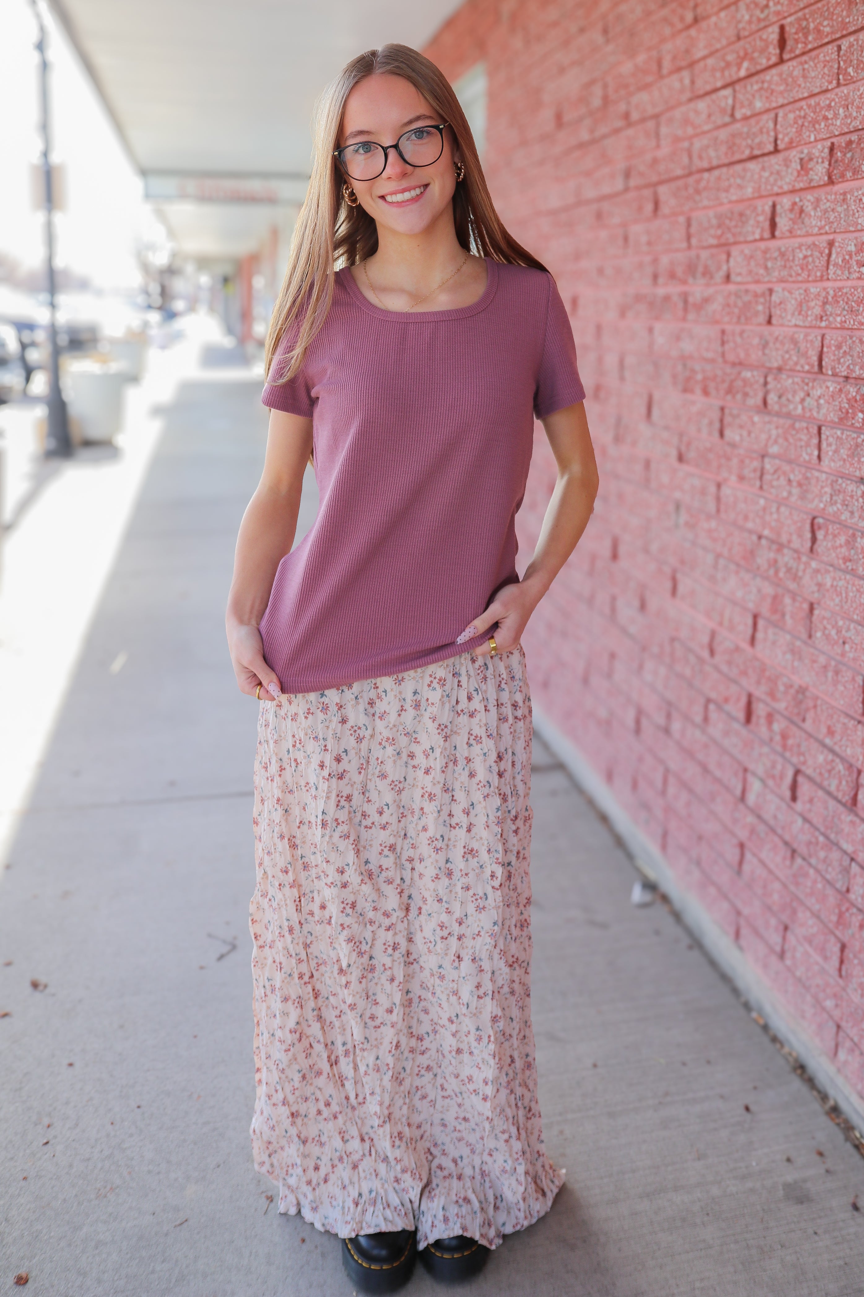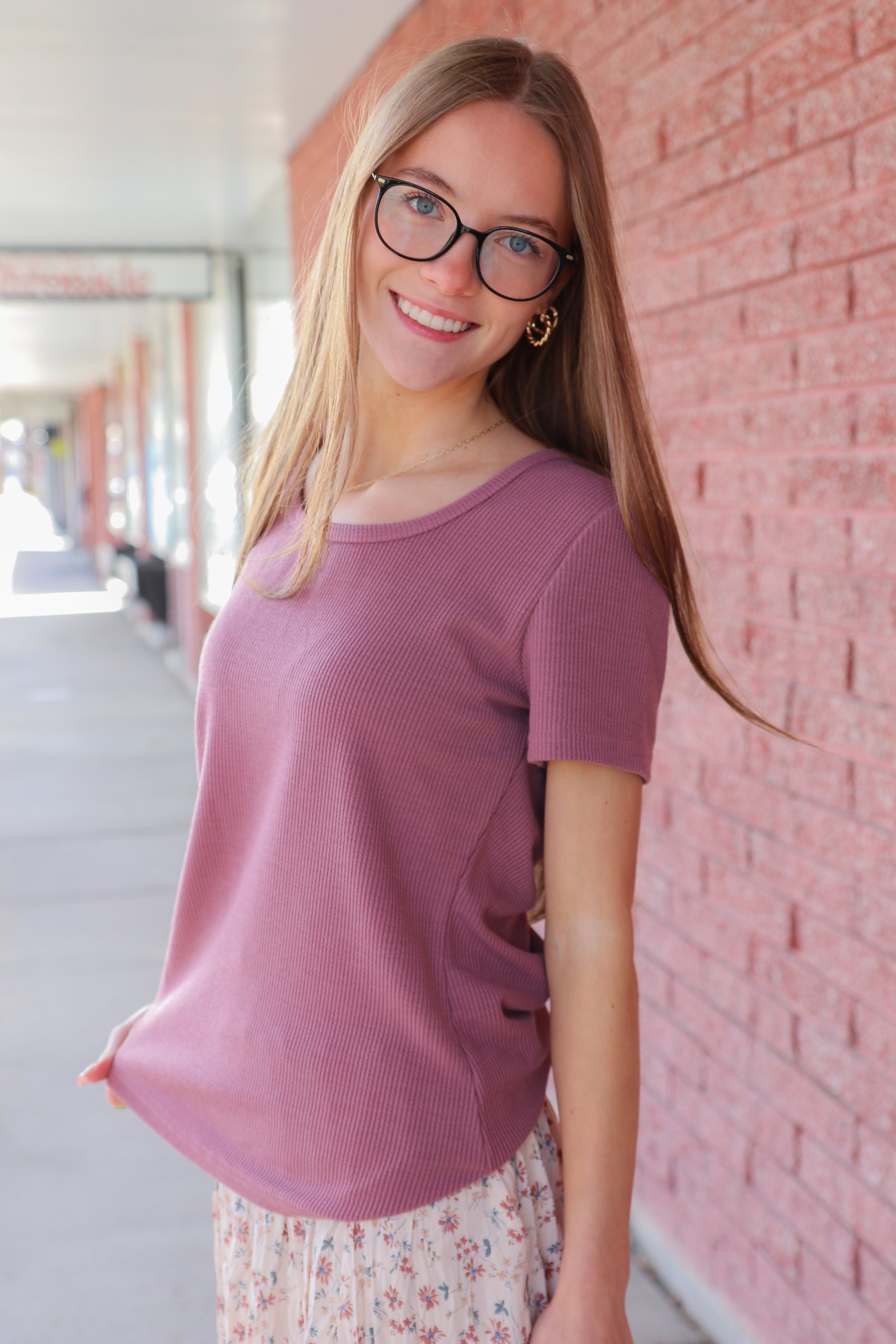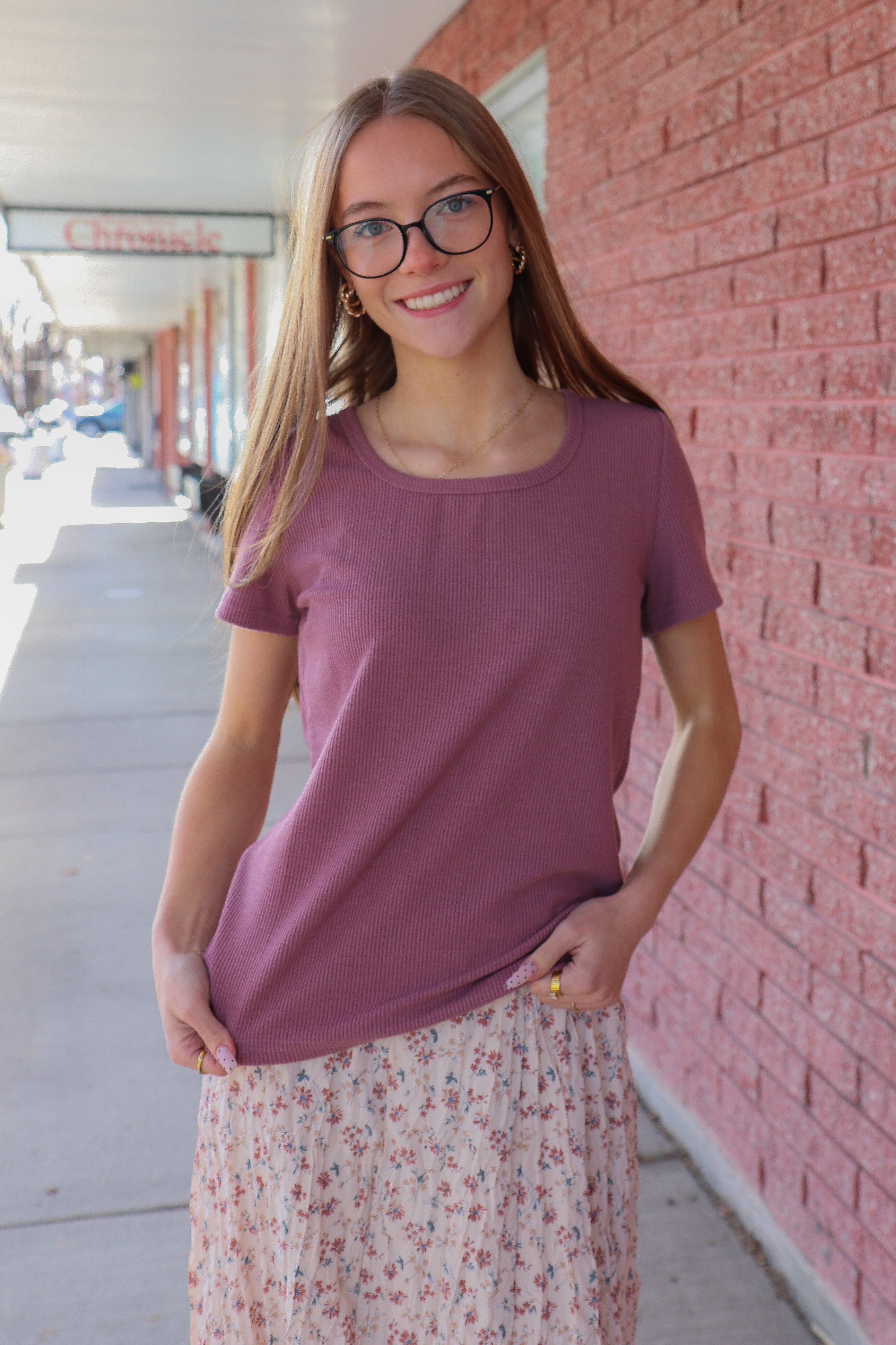 The Ribbed Sweater Scoop Tee in Faded Fig is the definition of elevated comfort. Soft, stretchy, and beautifully textured, this tee feels cozy without looking casual. The scoop neckline flatters the collarbone and adds a feminine touch, while the ribbed sweater knit gives it substance and polish. The muted fig tone is rich and grounding, making this an easy neutral you’ll reach for again and again.