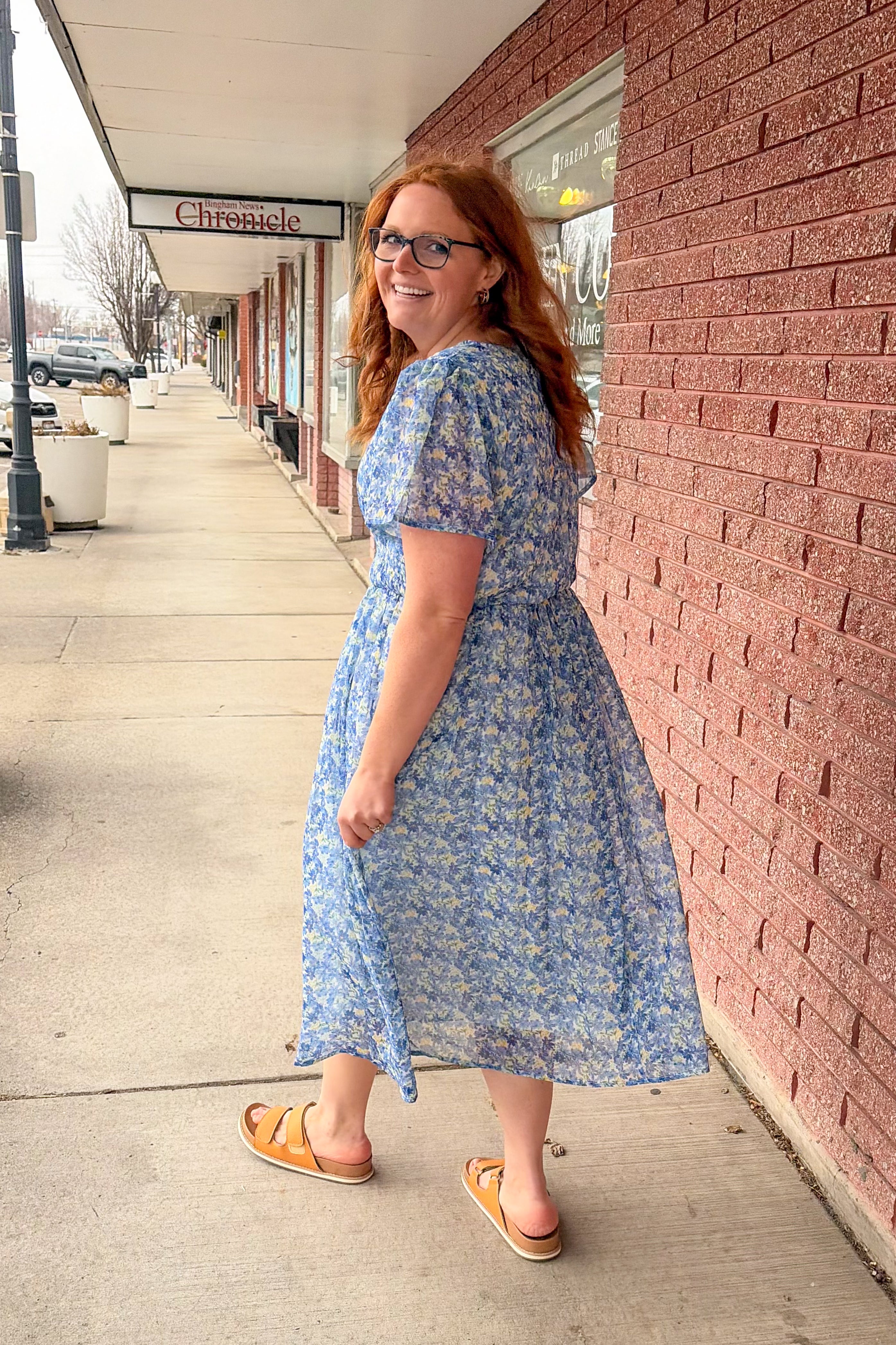 Effortlessly feminine and easy to wear, this blue floral day dress is perfect for warm, sunny days. Designed with a flattering smocked waistline and soft chiffon fabric, it creates a comfortable silhouette that moves beautifully. The V-neckline and short sleeves keep the look light and classic, while side pockets add a practical touch you’ll love.