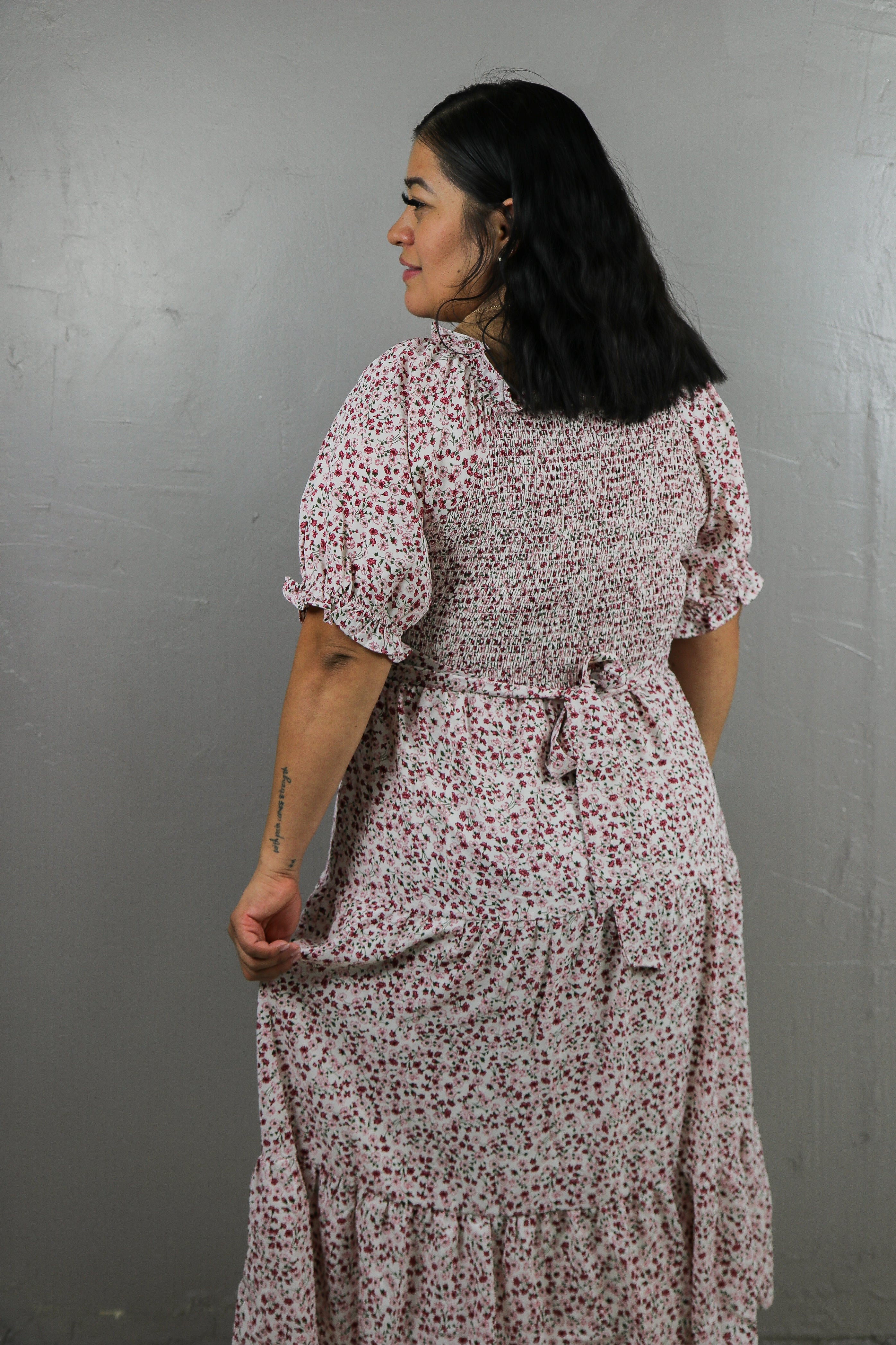 Romantic in the most timeless way, the Sherelle Dress feels like something pulled from a vintage love story and refreshed for modern days. With its creamy backdrop sprinkled in dainty red florals, this tea-length beauty is equal parts sweet and statement-making. The smocked bodice hugs just right, the puff sleeves add a soft dose of drama, and the tiered skirt brings that floaty, twirl-worthy movement we can’t resist. Perfect for early spring, garden parties, or Valentine-adjacent moments when you want your outfit to feel special without trying too hard.