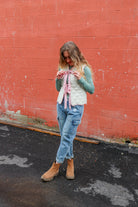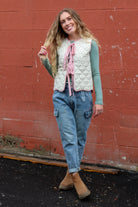 Charming and nostalgic, the Tie Front Quilted Vest brings cottagecore dreams to life. Featuring a soft cream background with delicate ditsy florals, this sleeveless vest is finished with two statement-making satin ribbon ties in blush pink for a feminine, vintage-inspired finish.